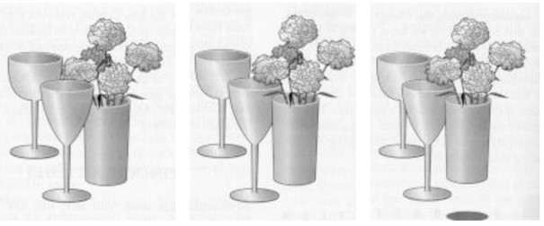 比如下图,左边第一张是遮挡和几何透视一致大脑会判断花瓶在两个杯子中间;中间那张大脑会产生视觉矛盾,遮挡提示花瓶应该在最前面,而透视位置高速我们花瓶似乎在杯子中间;最右边那张加入阴影以后,就解决了视觉矛盾,原来杯子是悬空的;